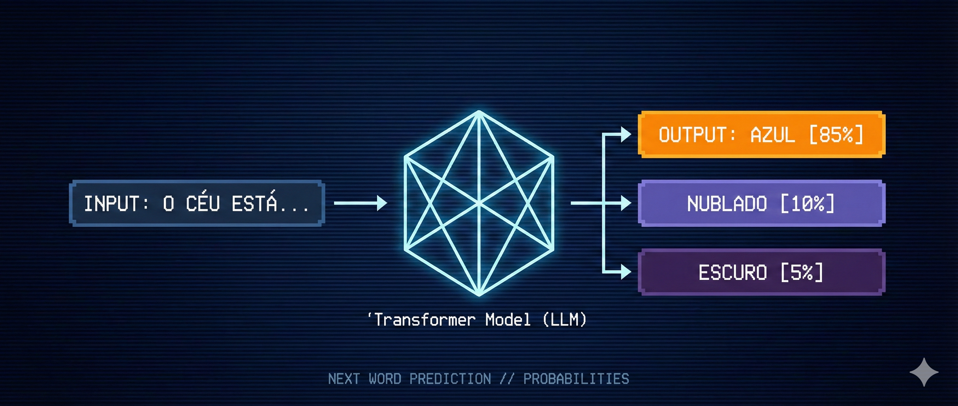 Agora imagine que você tem uma máquina capaz de analisar tudo que o Galvão disse até aquele momento — o tom, o ritmo, os bordões, o contexto do jogo — e prever qual seria a próxima palavra que ele diria. “Vai que é tua…“, “Haja coração…“, “GOOOOOL…“?