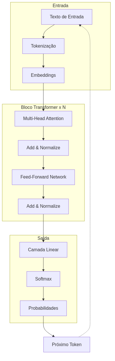 O diagrama acima ilustra o fluxo de dados através de um Transformer. O texto entra, é convertido em embeddings, passa por múltiplas camadas de atenção e redes feed-forward, e finalmente produz uma distribuição de probabilidades sobre o vocabulário.