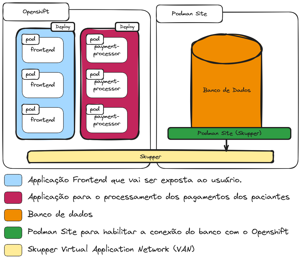 Agora, a aplicação frontend e backend estão se comunicando com o banco de dados que está rodando em um site podman, através da VAN do Skupper.
